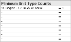 11, and for vOrUnitType1 you entered12. FH Analytics recognizes that both of type codes 11 and 12 refer to UnitType1.On the Compliance → Standard of Cover tab, in the lower left corner of the interface, under Minimum Unit Type Counts, the name of the unit type listed is 11 Engine - 12 Truck or aerial, and you can enter a total number of units for all your vehicles of type codes 11 and 12.