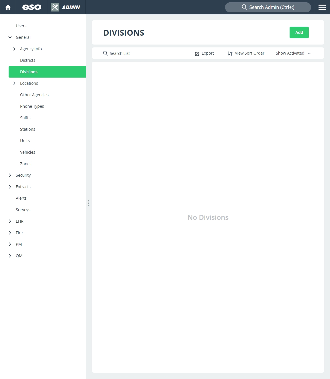 Divisions are major areas of operational or administrative divisions within the agency, such as training, operations, administration, and so forth. In the Admin module, you can build a list of menu options that correspond to the divisions in the agency's administration.