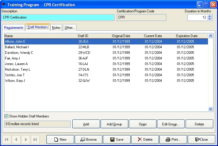 The Staff Member Training Program Detail dialog box appears for that staff member, set to the Basic tab.