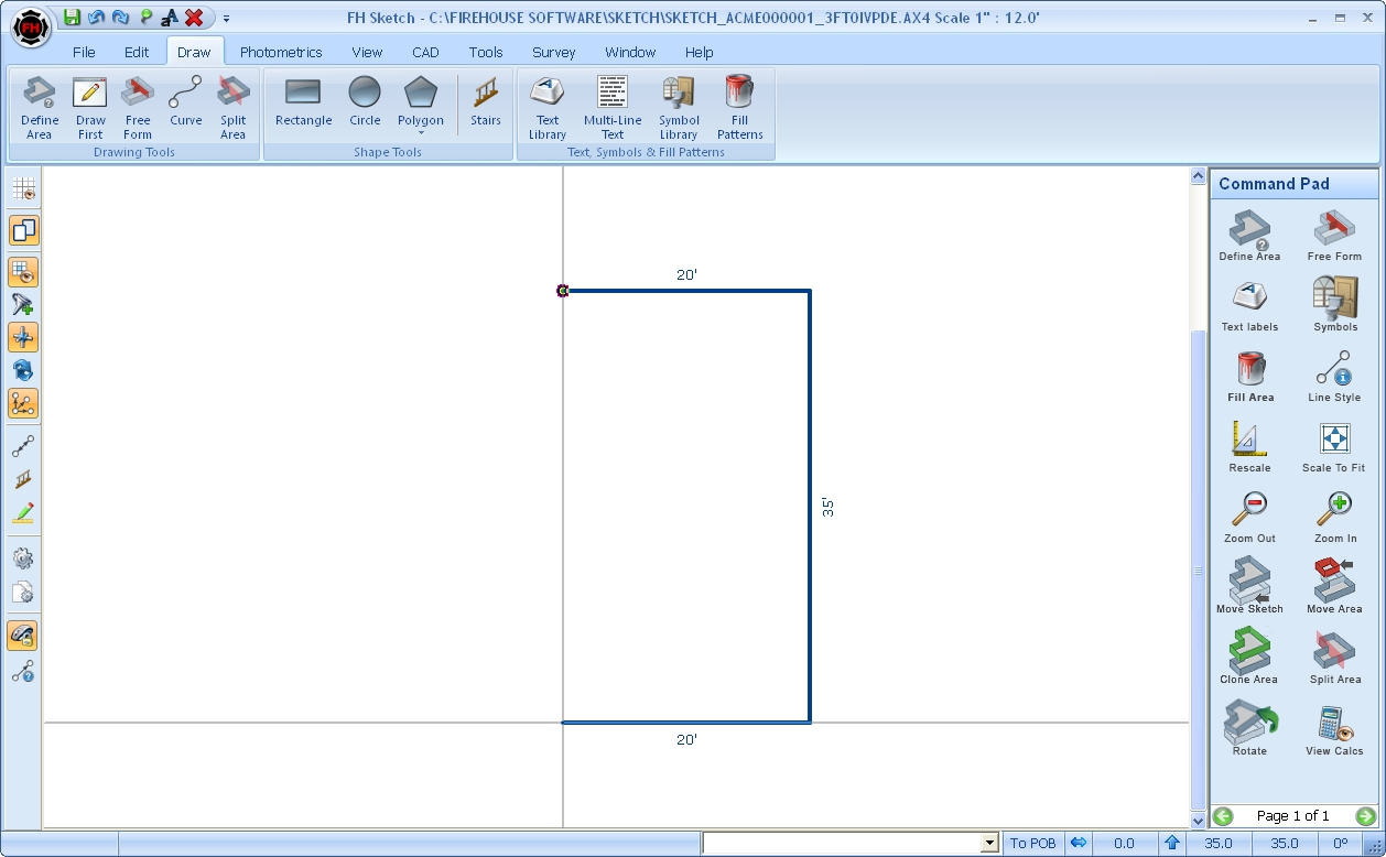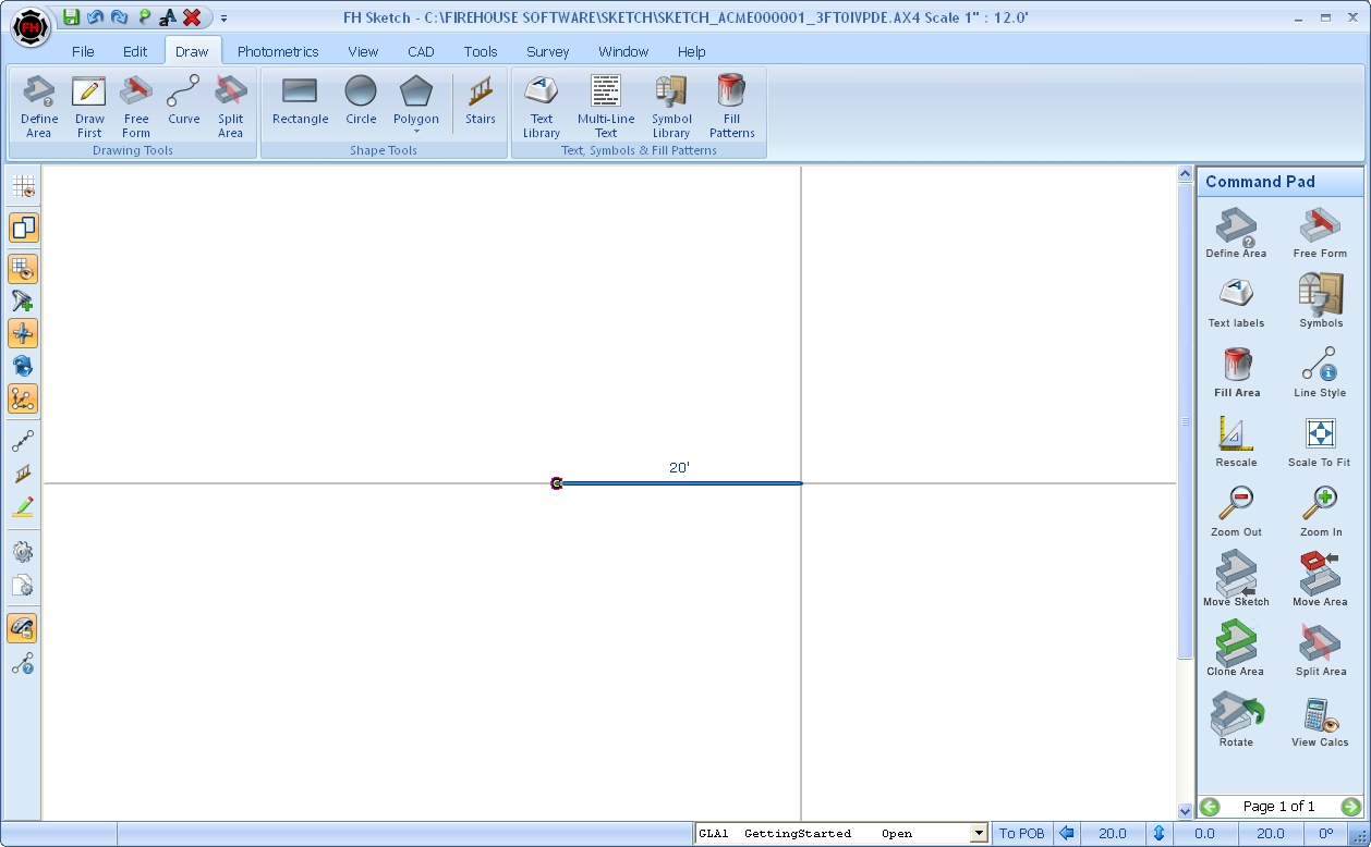 FH Sketch draws a line 20' to the right and then waits for your next entry, to define the next line in the area.