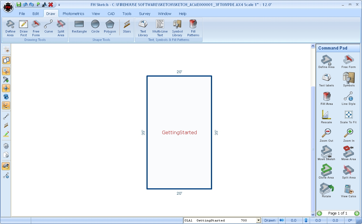 Once you have a basic understanding of defining areas and drawing lines, you are ready to draw an area and let FH Sketch perform the calculations. There are three basic concepts to drawing areas in FH Sketch: defining the area, establishing the POB (point of beginning), and drawing and closing the area.