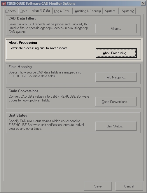 In the FIREHOUSE Software CAD Monitor Options dialog box, on the Filters & Data tab, the new Abort Processing section and button appear.