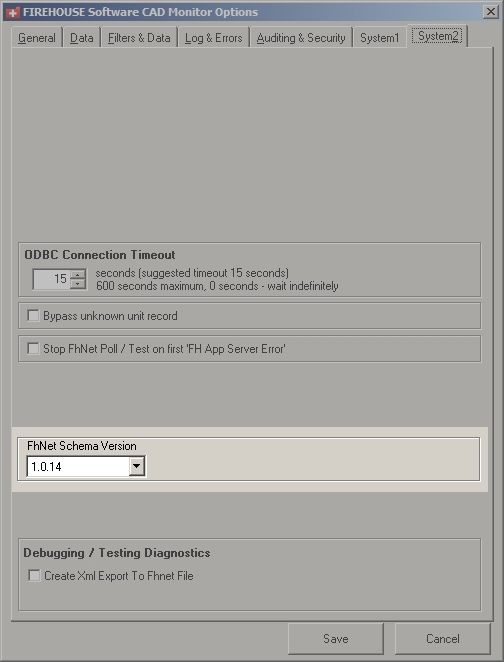 In the FIREHOUSE Software CAD Monitor Options dialog box, on the System2 tab, the new FhNet Schema Version option appears.
