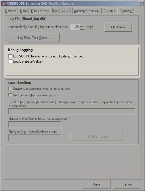 To support this additional logging, in the FIREHOUSE Software CAD Monitor Options dialog box, on the Log & Errors tab, the Log SQL DB Interactions (Select, Update, Insert, etc) and Log Database Values options now appear.