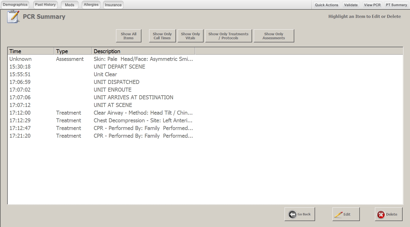 The PCR Summary screen appears, and provides an informal synopsis of all the response times, assessment information, treatments, and so forth, for the patient.