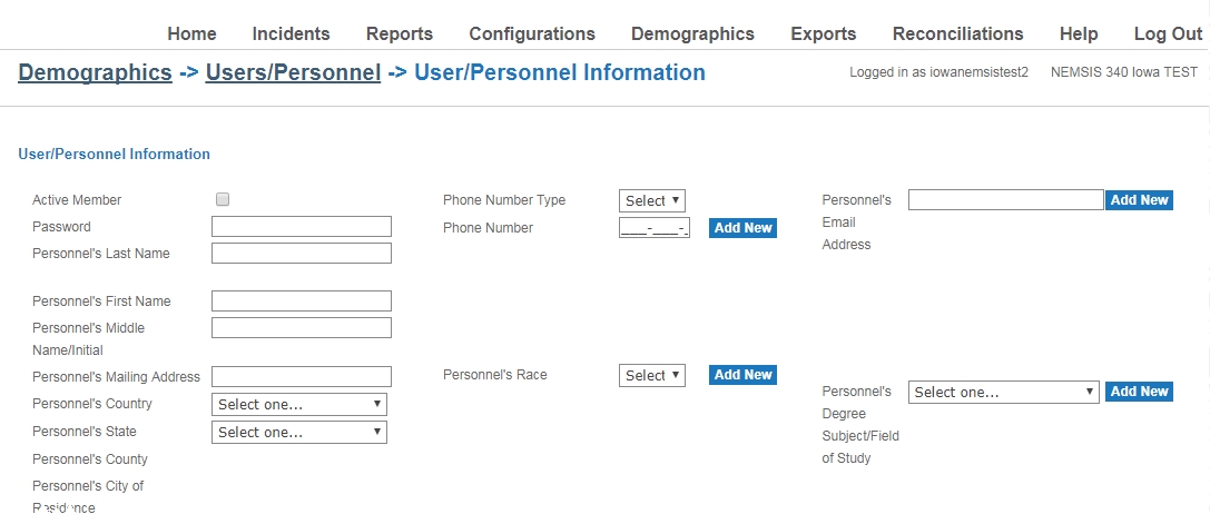 The Configurations > Users/Personnel > User/Personnel Information or Demographics -> Users/Personnel > Users/Personnel Information page appears, and the fields populate with existing information for the user.