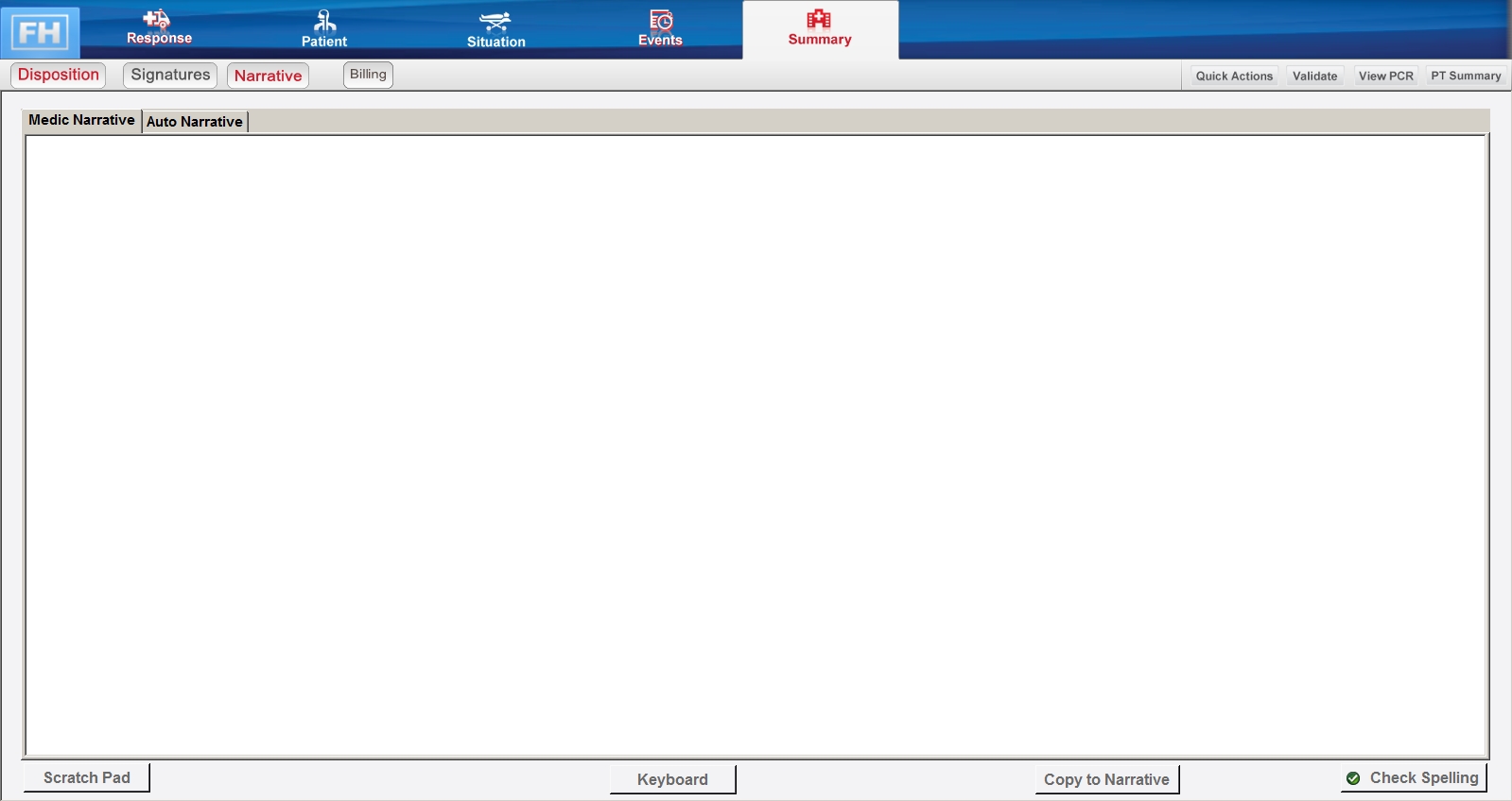 An automatic narrative is generated by the software, based on the information you entered in the other tabs in FH Medic. However, this automatic narrative may not capture critical information observed at the scene or through interacting with the patient, and should be supplemented with medic's narrative when necessary.
