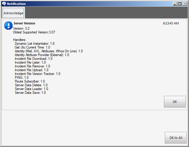 If the connection is successful, the Notification dialog box appears, indicating whether it could successfully connect to the server, and the FH Mobile Response version number of the server.